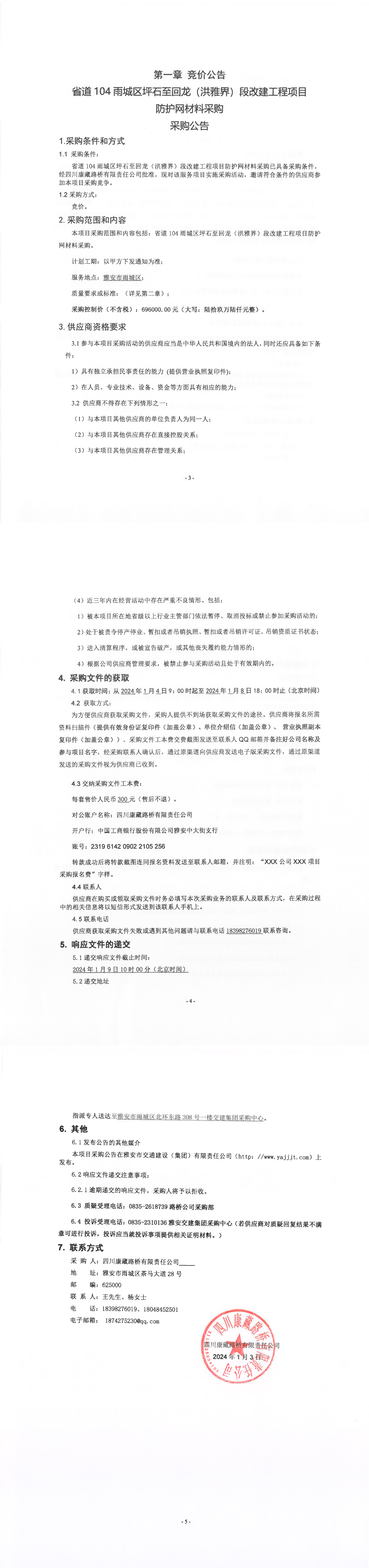 四川康藏路橋有限責(zé)任公司省道104雨城區(qū)坪石至回龍(洪雅界)段改建工程項(xiàng)目防護(hù)網(wǎng)材料采購(gòu)公告