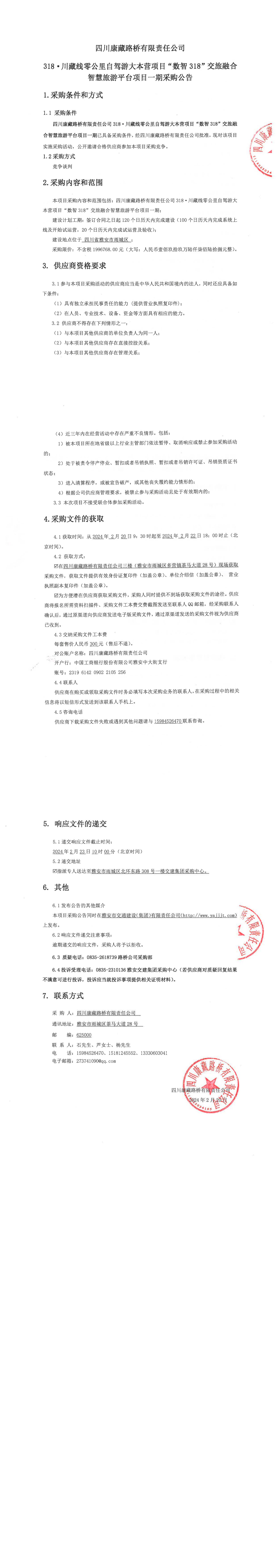 四川康藏路橋有限責(zé)任公司318·川藏線零公里自駕游大本營項(xiàng)目“數(shù)智318”交旅融合智慧旅游平臺(tái)項(xiàng)目一期采購公告