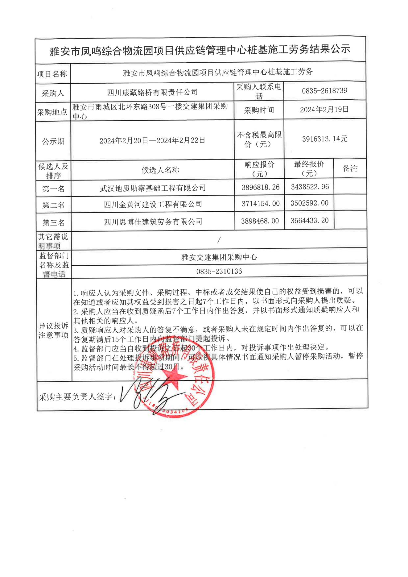 四川康藏路橋有限責任公司雅安市鳳鳴綜合物流園項目供應鏈管理中心樁基施工勞務結(jié)果公示