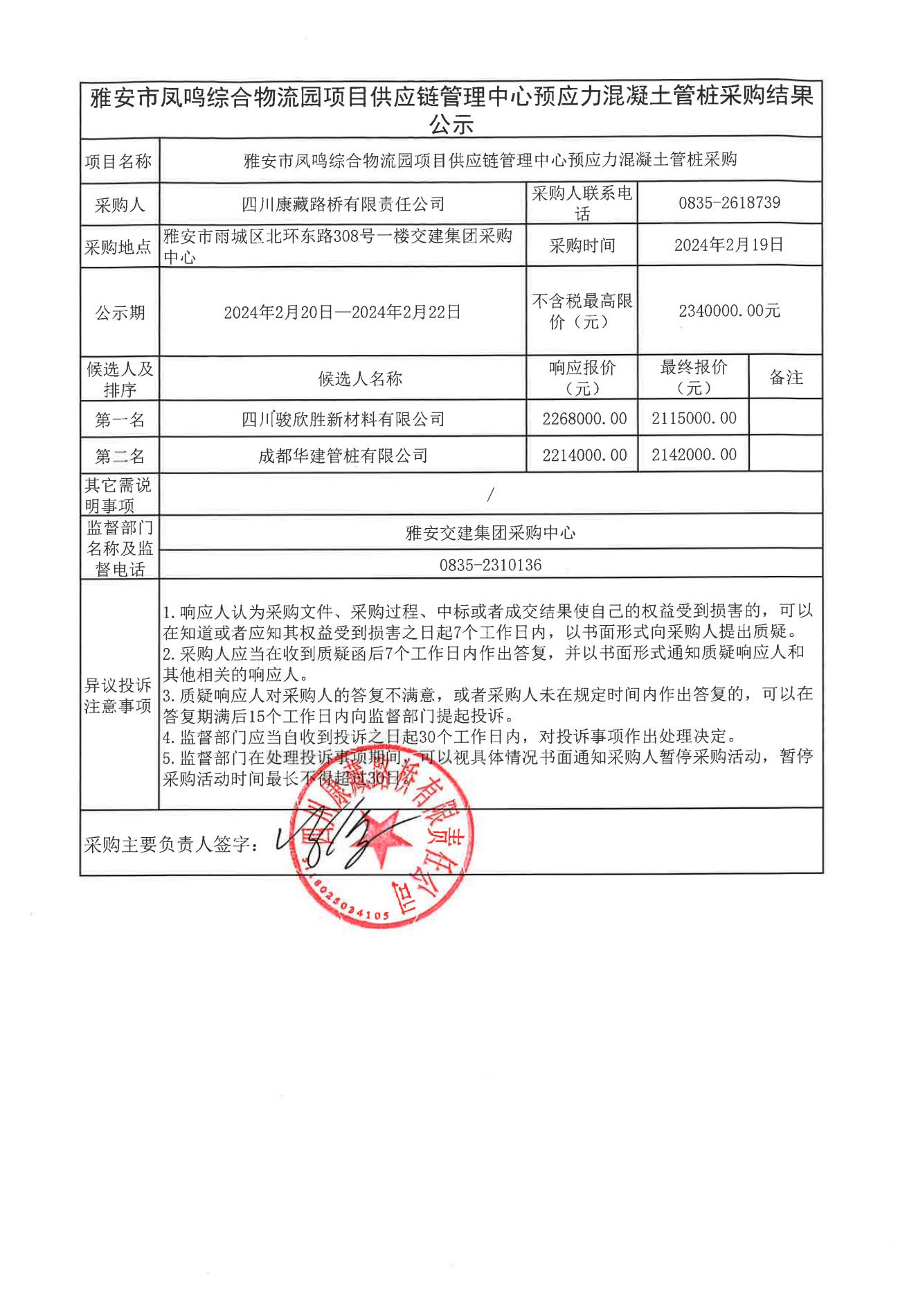 四川康藏路橋有限責(zé)任公司雅安市鳳鳴綜合物流園項目供應(yīng)鏈管理中心預(yù)應(yīng)力混凝土管樁采購結(jié)果公示