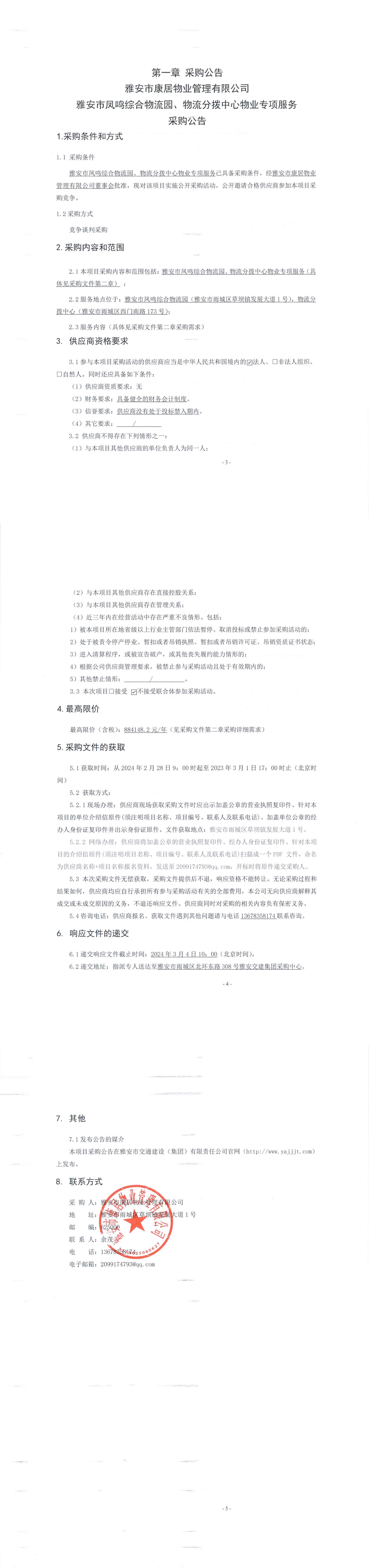 雅安市康居物業(yè)管理有限公司雅安市鳳鳴綜合物流園、物流分撥中心物業(yè)專項服務(wù)采購公告