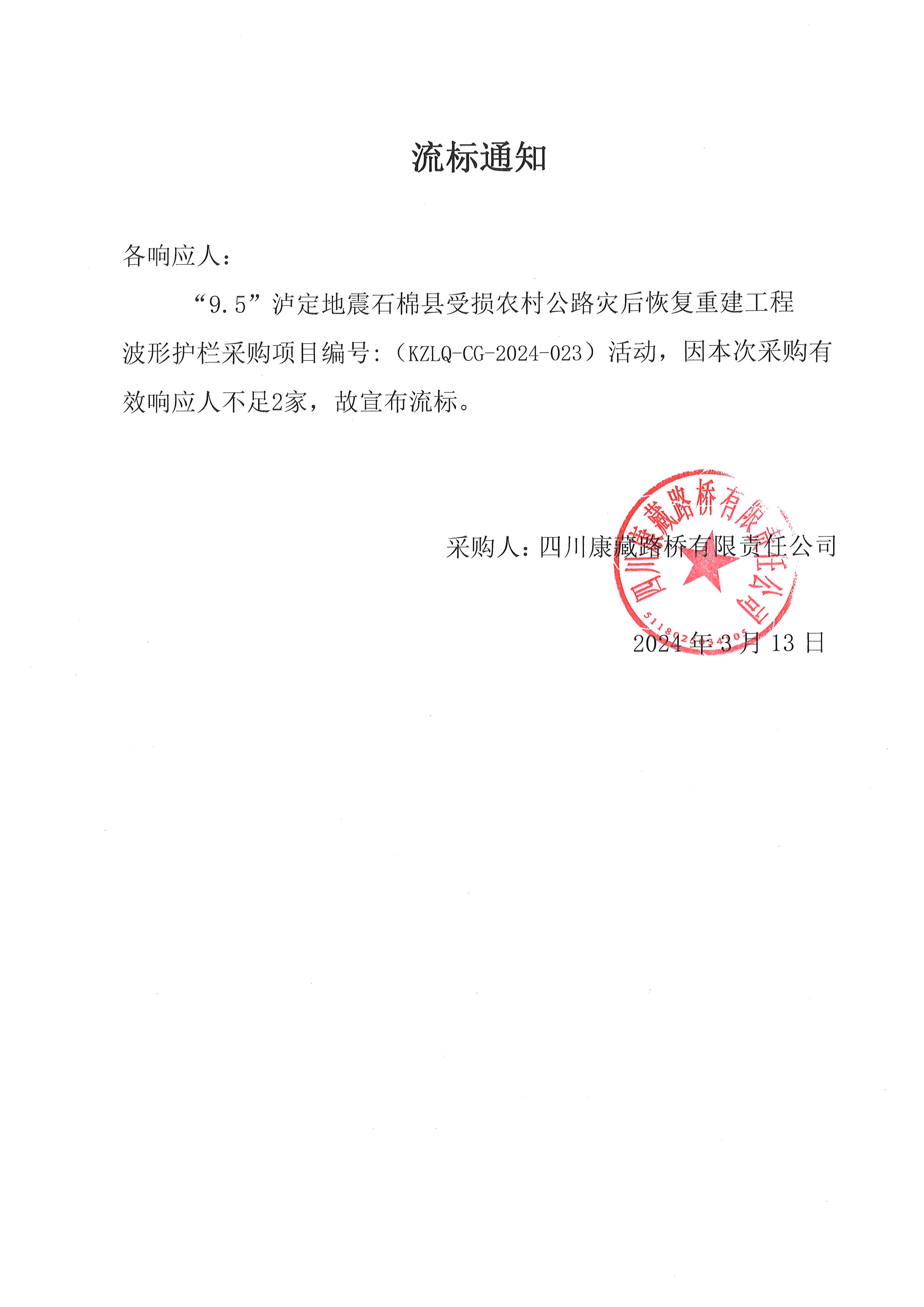 四川康藏路橋有限責(zé)任公司“9.5”瀘定地震石棉縣受損農(nóng)村公路災(zāi)后恢復(fù)重建工程波形護(hù)欄采購(gòu)流標(biāo)通知