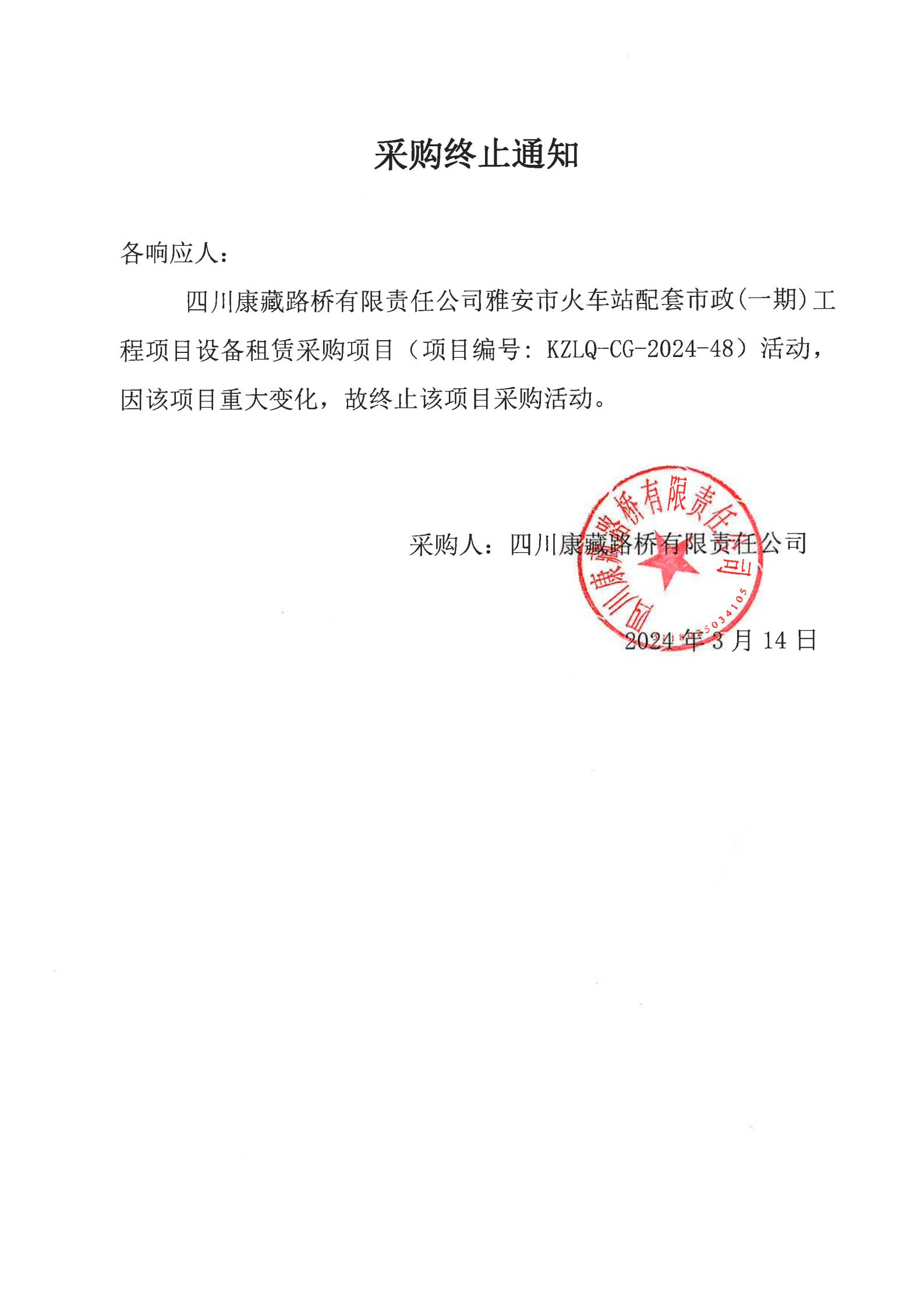 四川康藏路橋有限責(zé)任公司雅安市火車站配套市政(一期)工程項目設(shè)備租賃采購終止通知