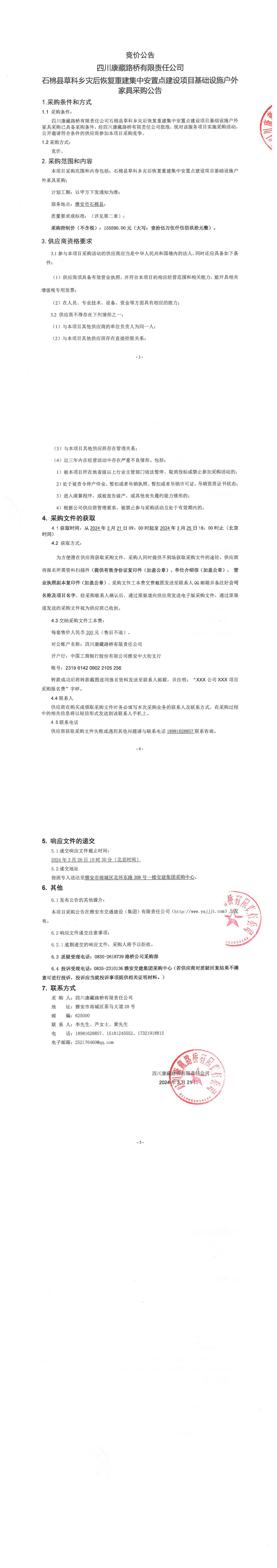 四川康藏路橋有限責(zé)任公司石棉縣草科鄉(xiāng)災(zāi)后恢復(fù)重建集中安置點(diǎn)建設(shè)項目基礎(chǔ)設(shè)施戶外家具采購公告
