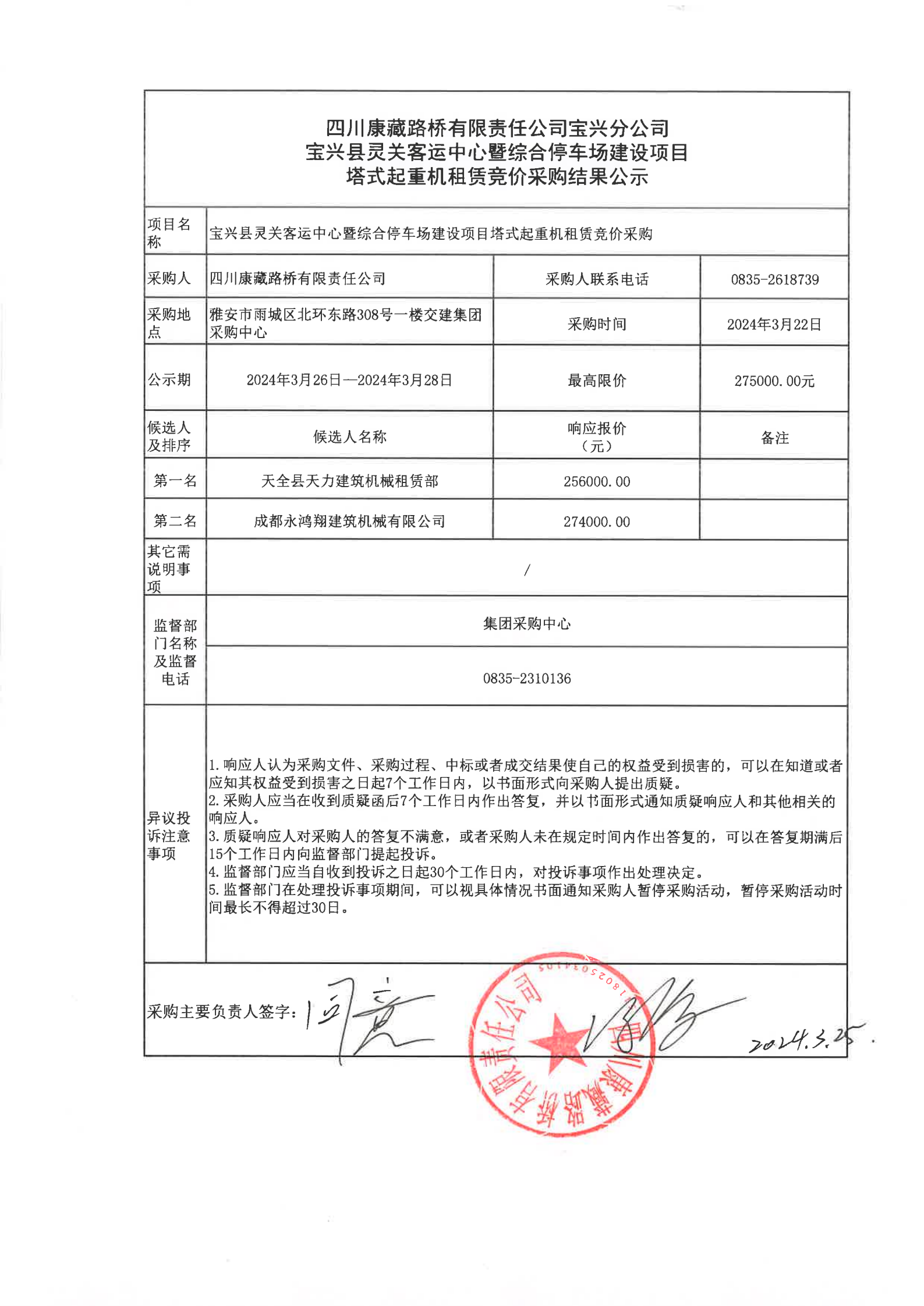 四川康藏路橋有限責(zé)任公司寶興縣靈關(guān)客運(yùn)中心暨綜合停車場建設(shè)項(xiàng)目塔式起重機(jī)租賃競價采購結(jié)果公示