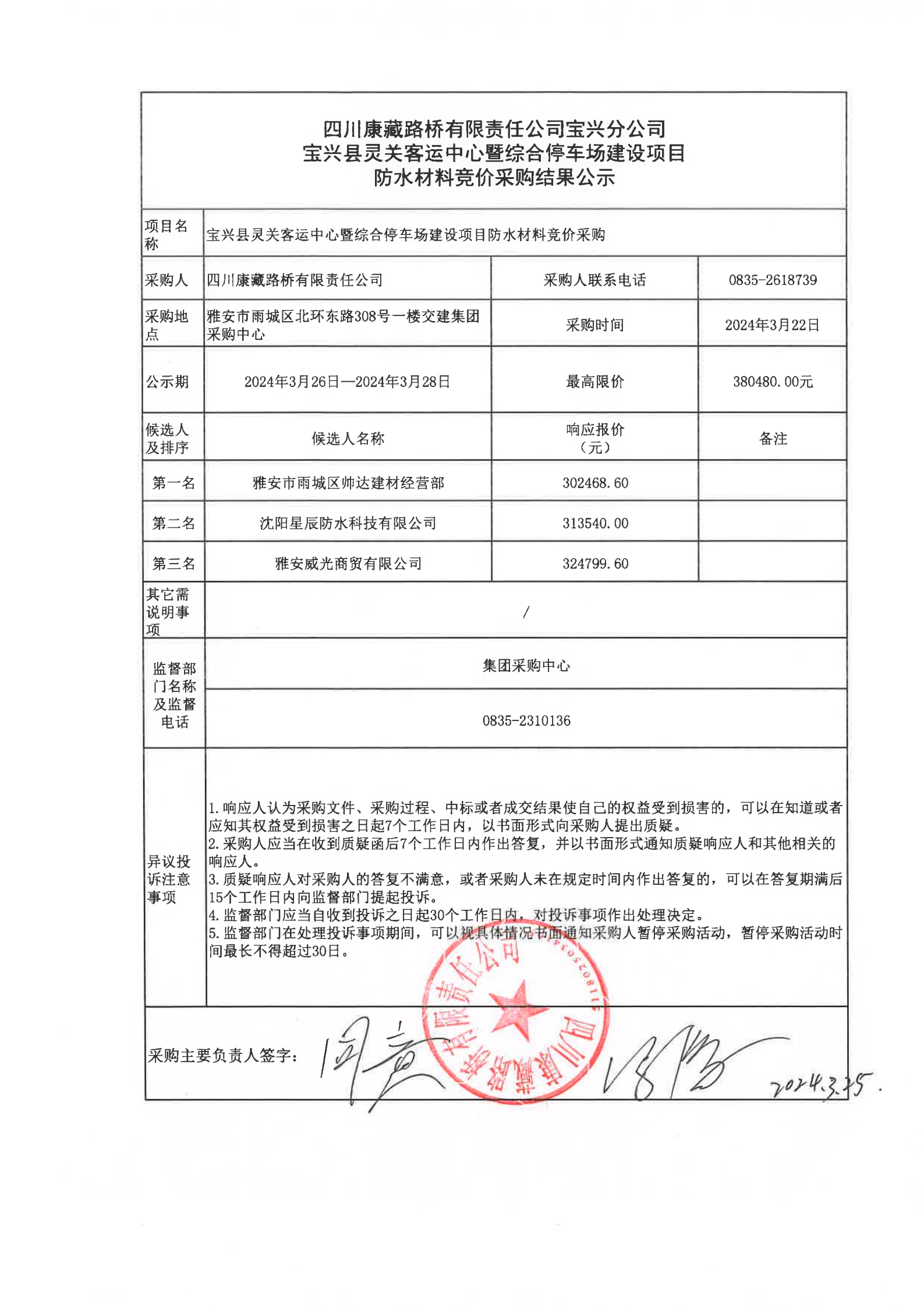 四川康藏路橋有限責(zé)任公司寶興縣靈關(guān)客運(yùn)中心暨綜合停車場(chǎng)建設(shè)項(xiàng)目防水材料競(jìng)價(jià)采購(gòu)結(jié)果公示