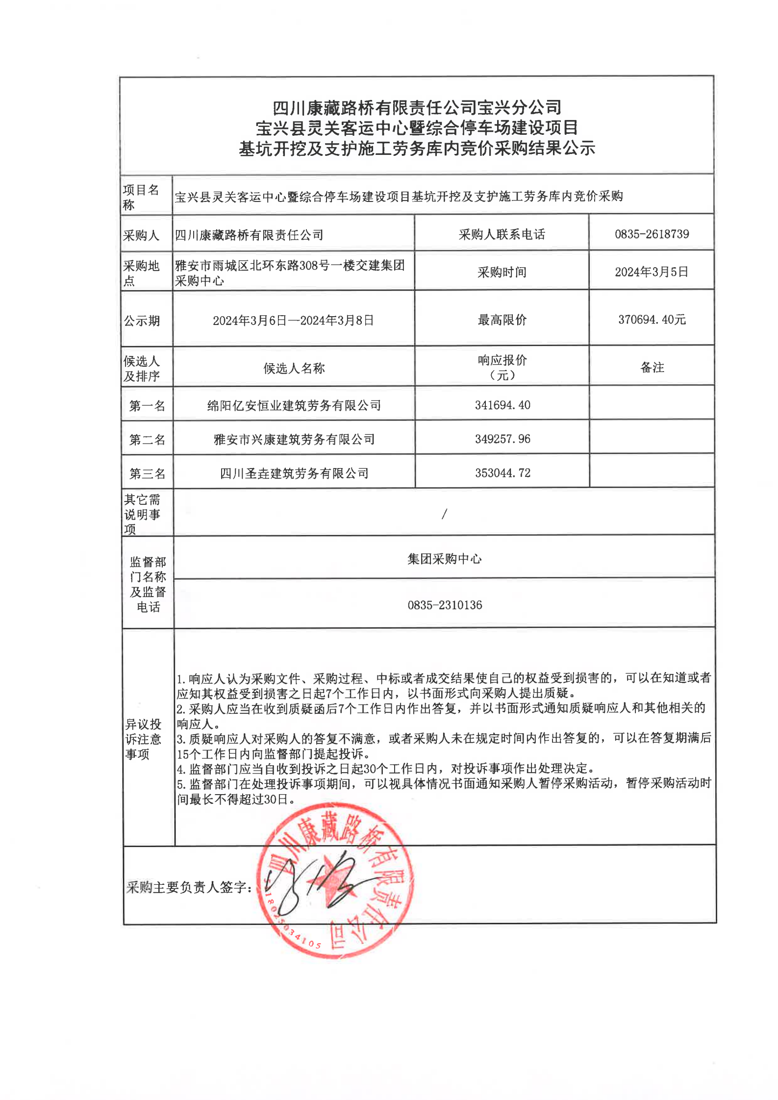 四川康藏路橋有限責任公司寶興分公司寶興縣靈關客運中心暨綜合停車場建設項目基坑開挖及支護施工勞務庫內(nèi)競價采購結(jié)果公示