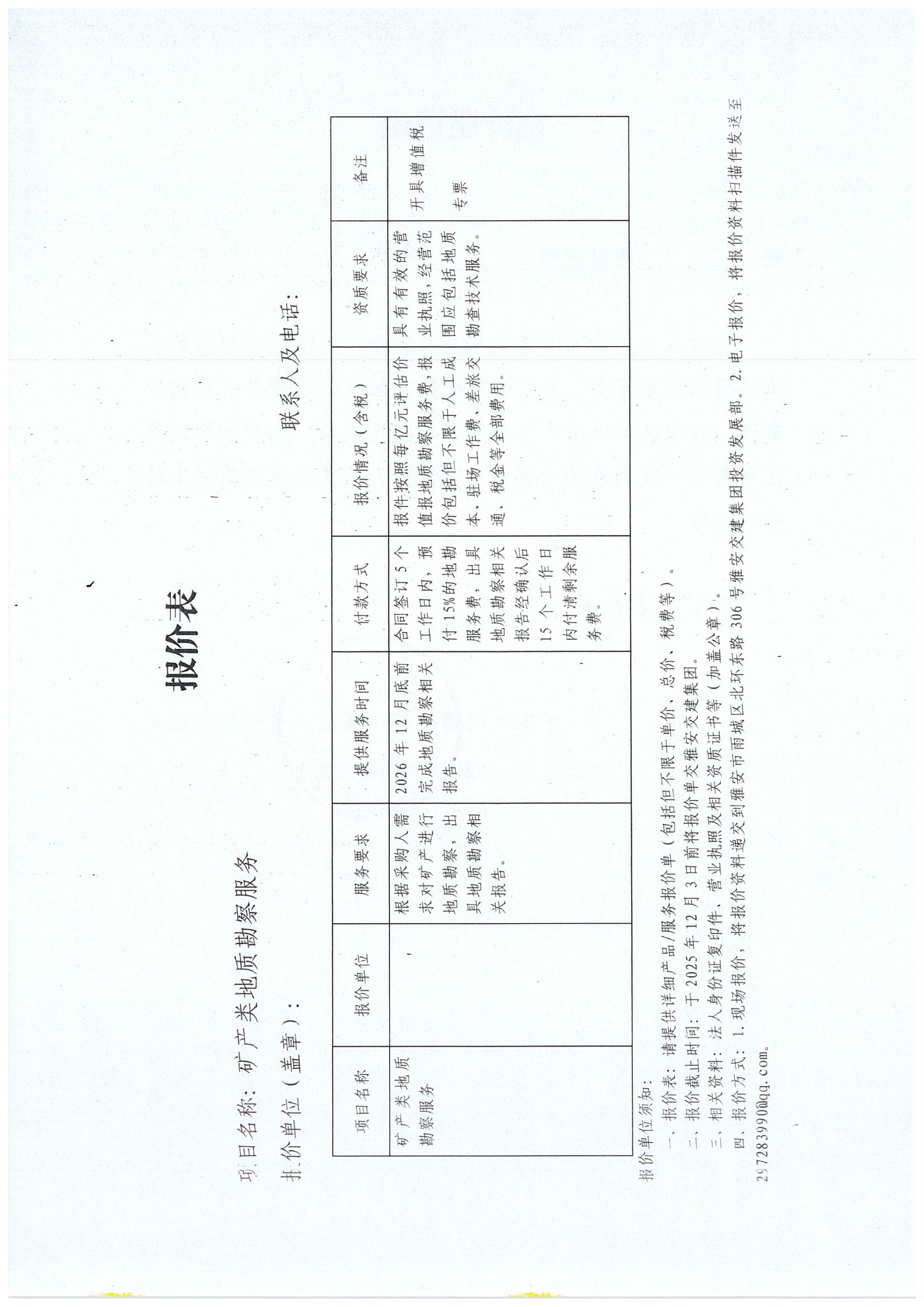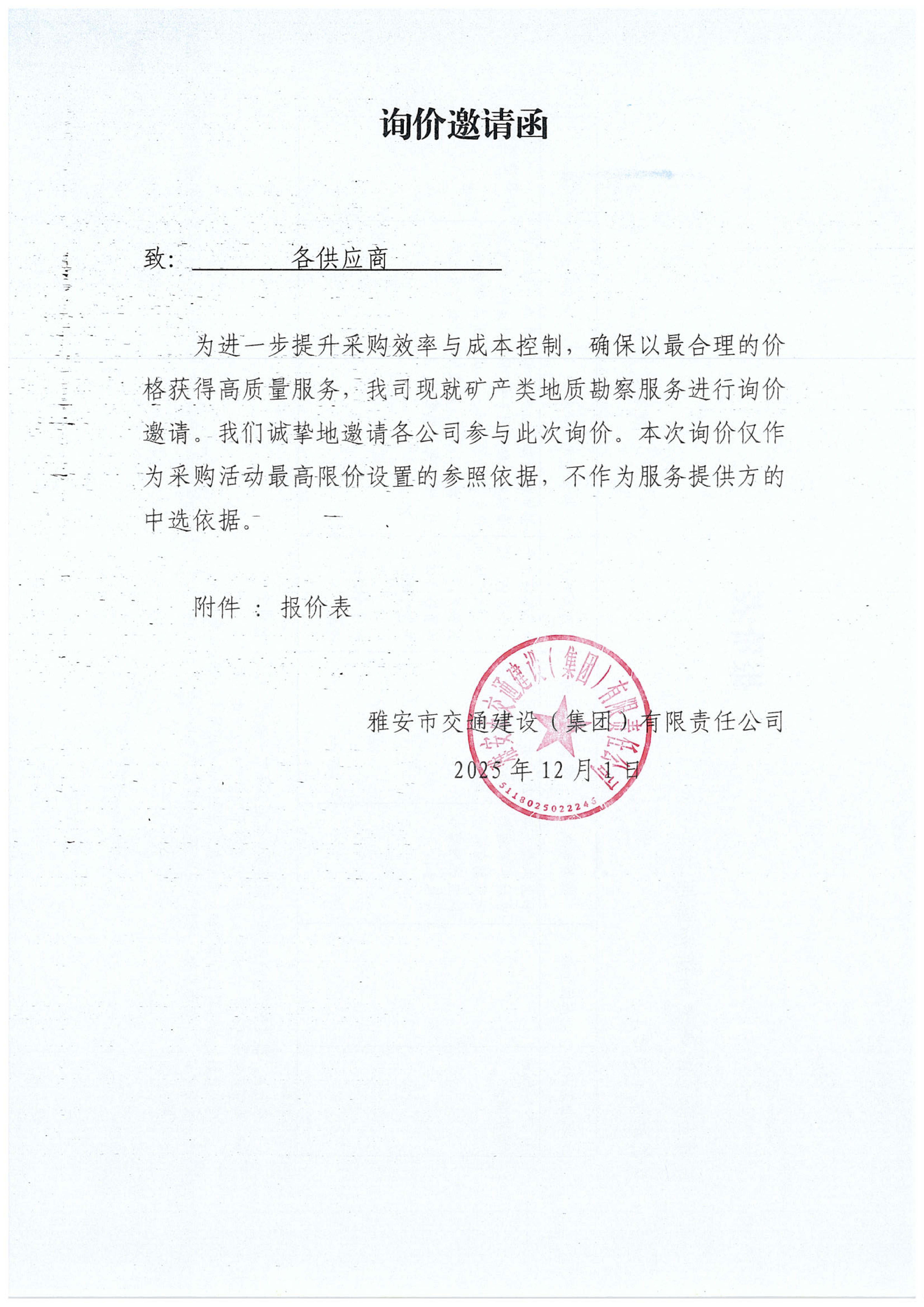關(guān)于雅安市交通建設(shè)(集團(tuán))有限責(zé)任公司礦產(chǎn)類地質(zhì)勘察服務(wù)限價的詢價函