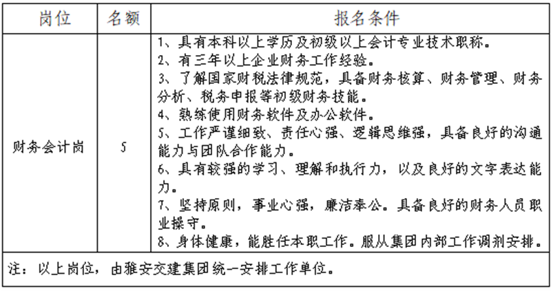 根據(jù)發(fā)展需要,決定面向社會公開招聘雅安市交通建設(集團)有限責任公司(以下簡稱“雅安交建集團”)所屬子公司財務工作人員5名,現(xiàn)將有關事項公告如下: