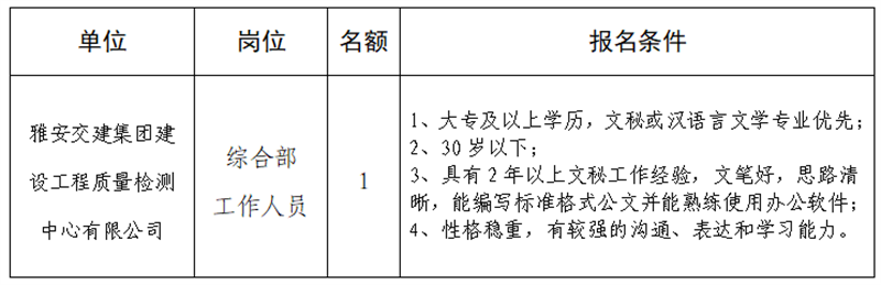 根據(jù)發(fā)展需要,決定面向社會(huì)公開招聘雅安市交通建設(shè)(集團(tuán))有限責(zé)任公司(以下簡(jiǎn)稱“雅安交建集團(tuán)”)所屬子公司工作人員1名,現(xiàn)將有關(guān)事項(xiàng)公告如下: