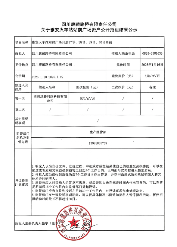 四川康藏路橋有限責任公司關于雅安火車站站前廣場資產(chǎn)公開招租結果公示