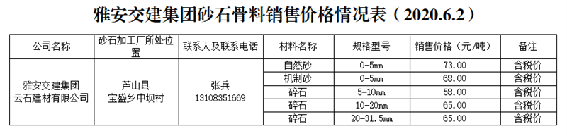 雅安交建集團(tuán)云石建材砂石骨料銷售價(jià)格情況表(2020.6.2)