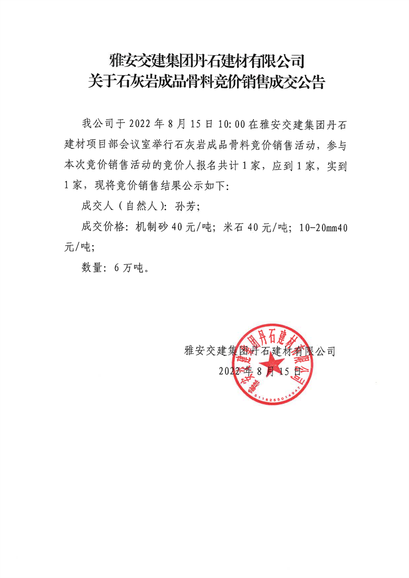 雅安交建集團(tuán)丹石建材有限公司關(guān)于石灰?guī)r成品骨料競(jìng)價(jià)銷(xiāo)售成交公告