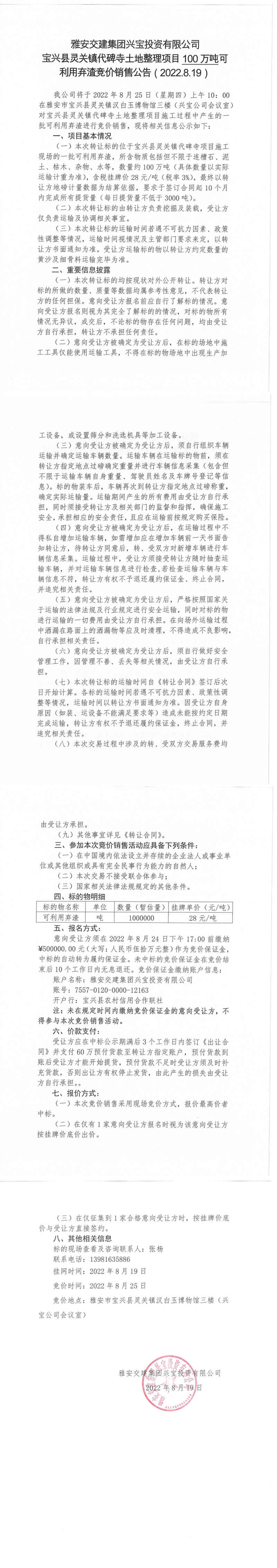 雅安交建集團興寶投資有限公司靈關(guān)鎮(zhèn)代碑寺土地整理項目10萬噸可利用棄渣競價銷售公告(2022.8.19)(1)
